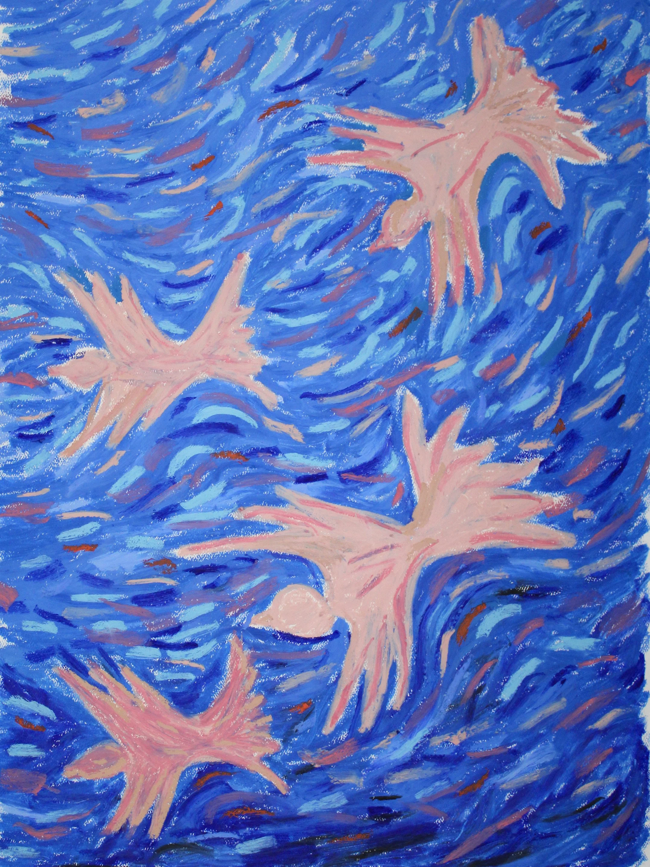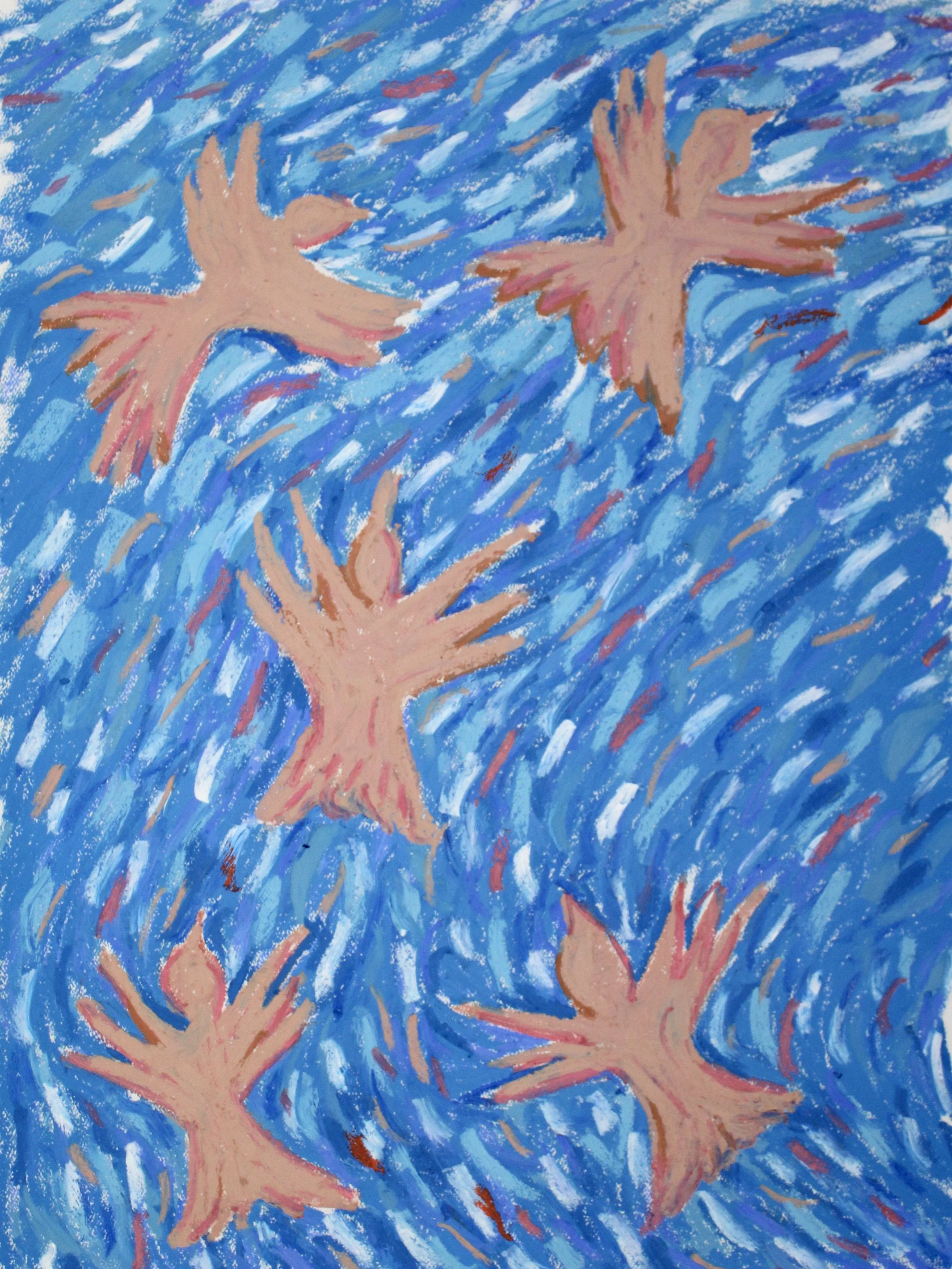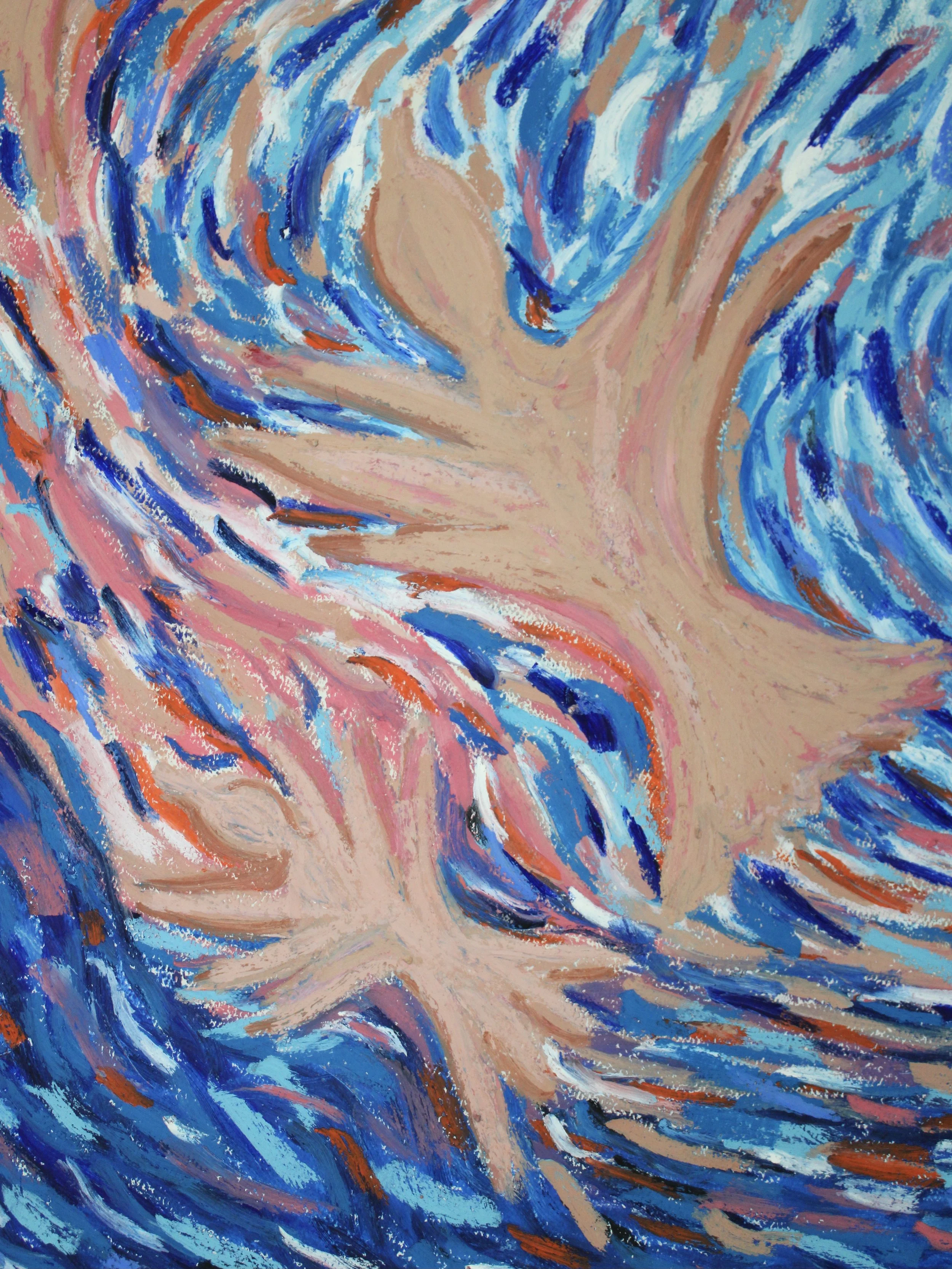 Oil pastel on paper, a four-part series depicting the duality of wings and wind, contemplating active flight vs. surrendering to the directions and whims of Mother Nature, inspired by watching large swarms of birds ride the wind like waves in the fall. Small strokes of color mimic the principles of pointillism and the tones of the ever-changing sky. Each piece measures 18”x24”