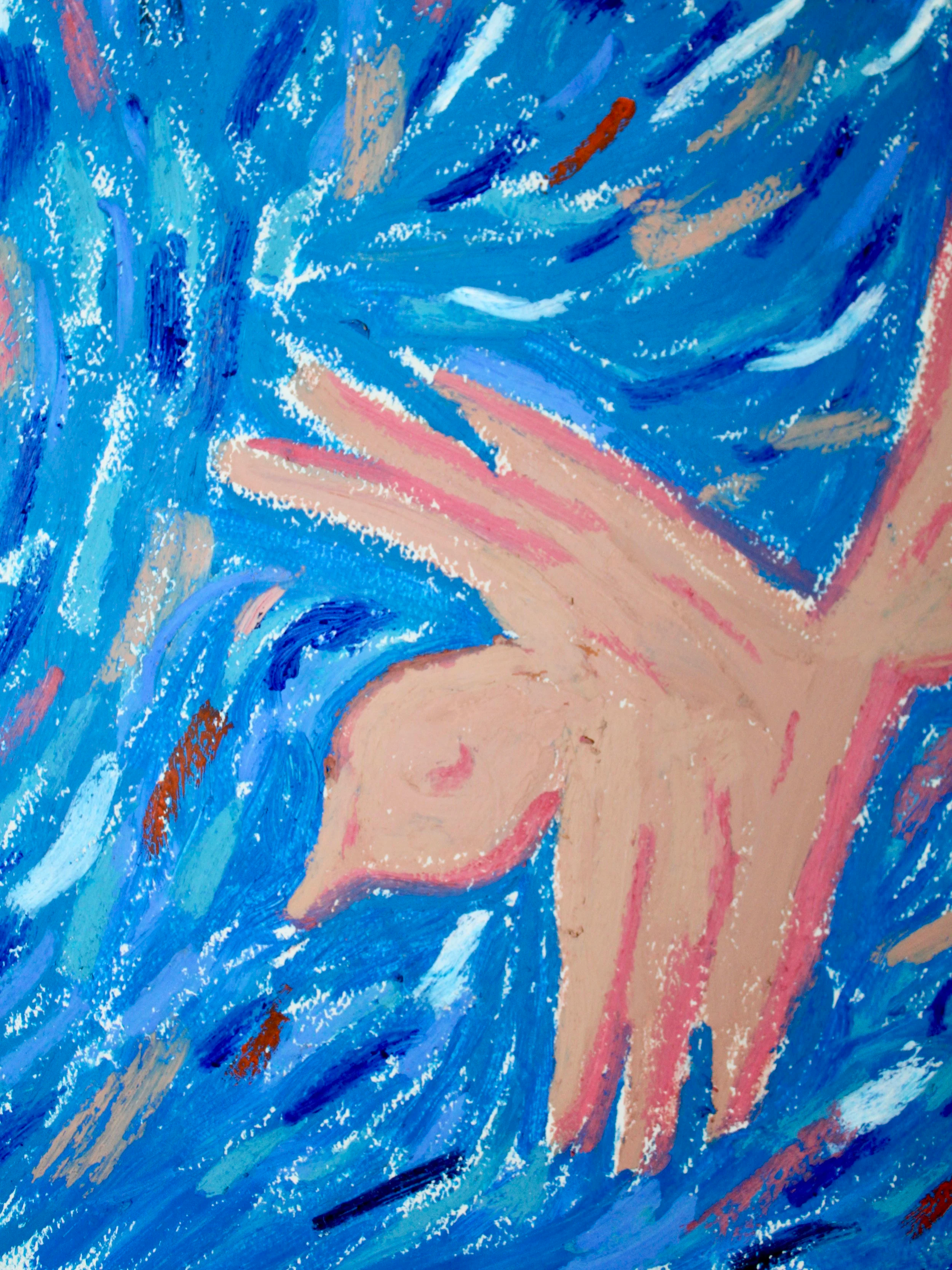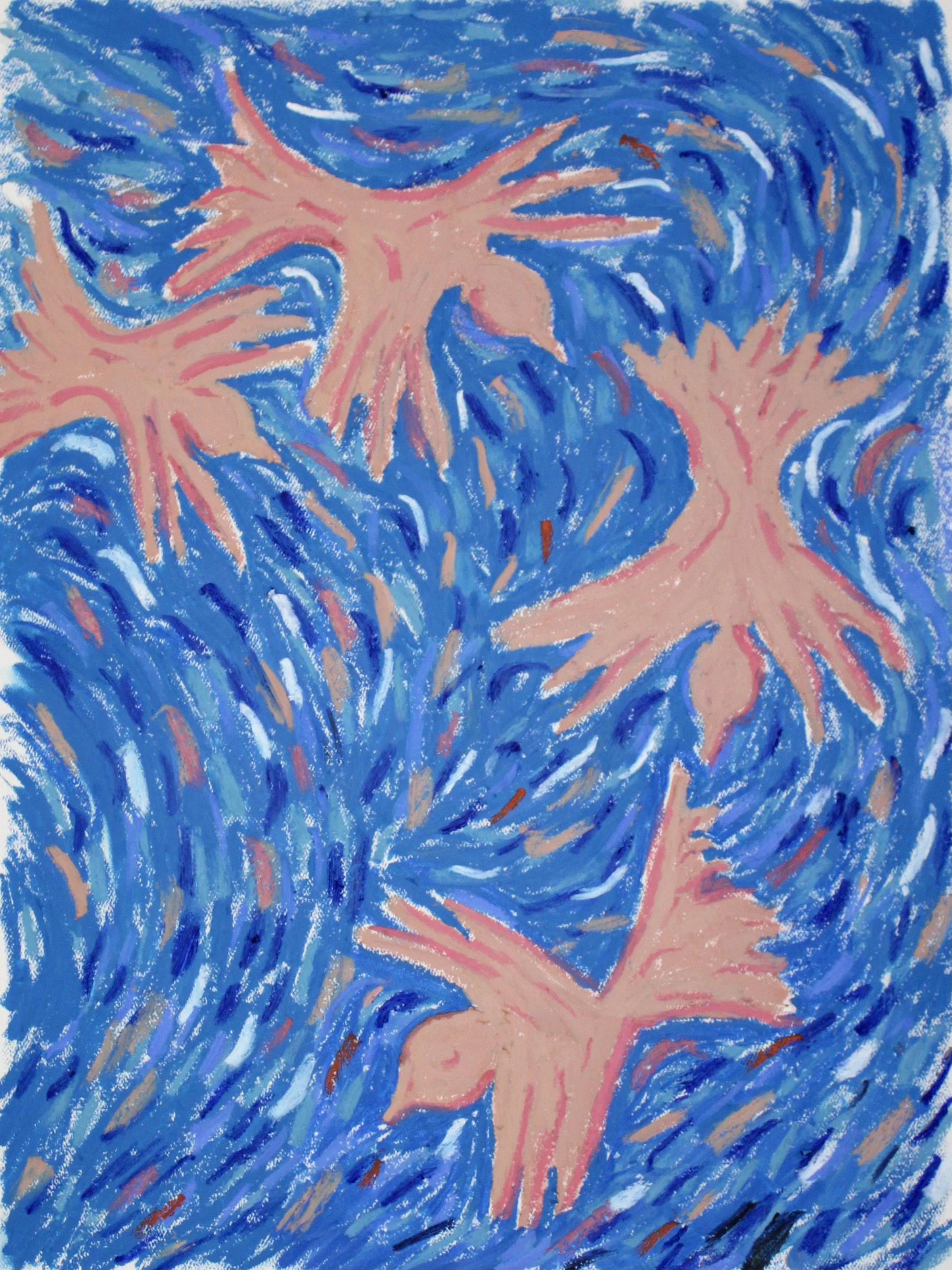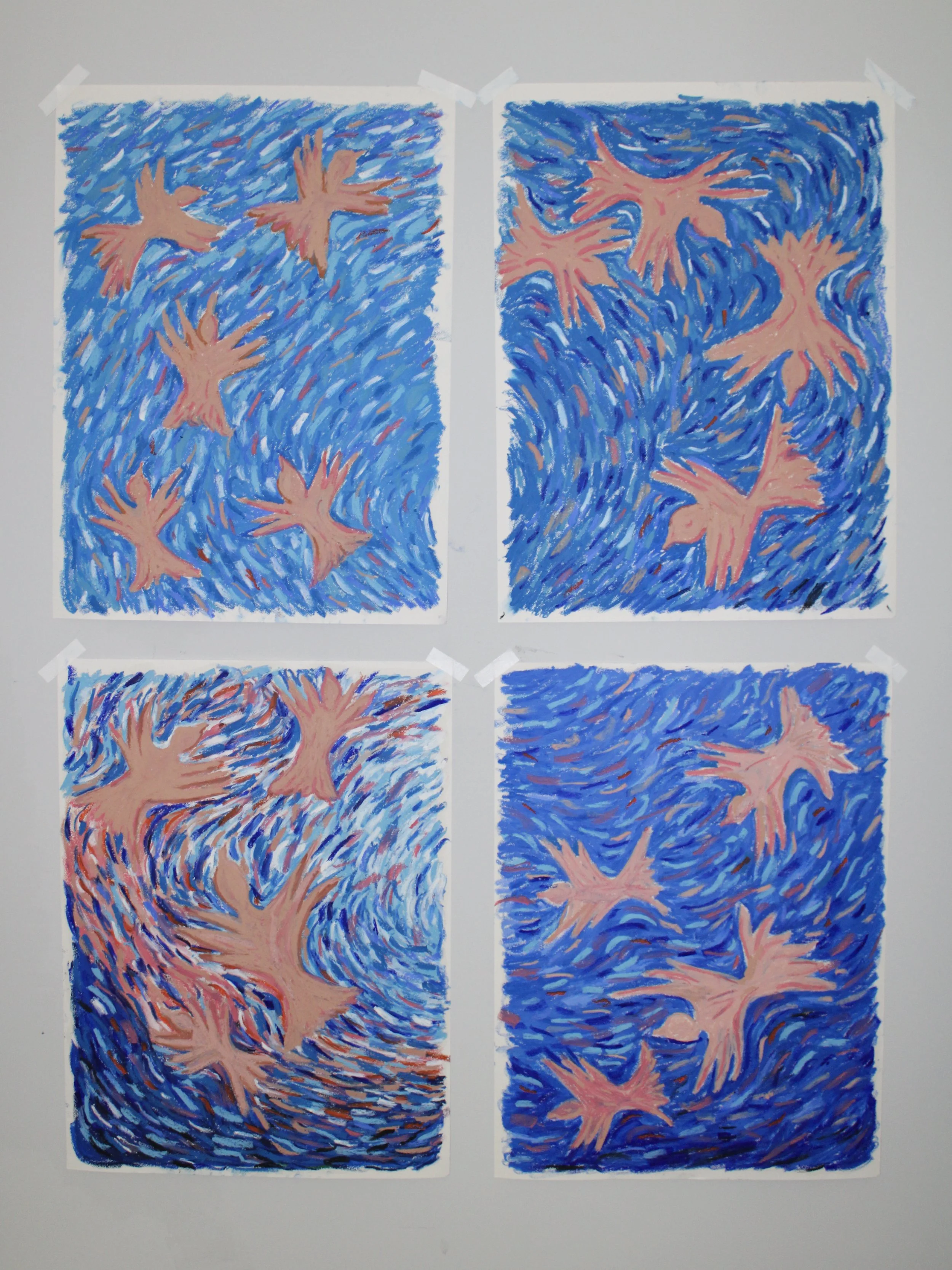 Oil pastel on paper, a four-part series depicting the duality of wings and wind, contemplating active flight vs. surrendering to the directions and whims of Mother Nature, inspired by watching large swarms of birds ride the wind like waves in the fall. Small strokes of color mimic the principles of pointillism and the tones of the ever-changing sky. Each piece measures 18”x24”